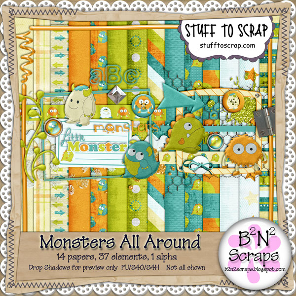 Becky of B2N2 Scraps has an adorable new kit out today called "Monsters All Around!"  The colors are fantastic and such fun to work with.  She has also put this in the $2 bin at Stuff to Scrap for today only.  The rest of the week, the kit and QP's will be on sale for 25% off.  There is a great little add-on that she is giving away at her speed scrap tomorrow night at 8:30 EST!!  I hope to see you there.